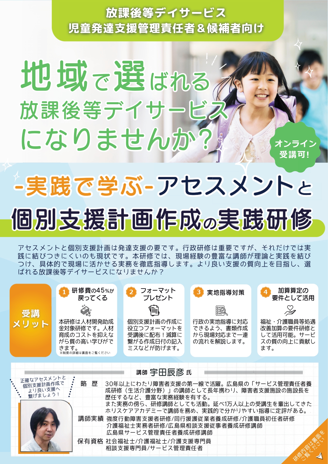 強度行動障害支援者研修/同行援護従業者養成研修/介護職員初任者研修/介護福祉士実務者研修/広島県相談支援従事者養成研修講師/広島県サービス管理責任者養成研修講師