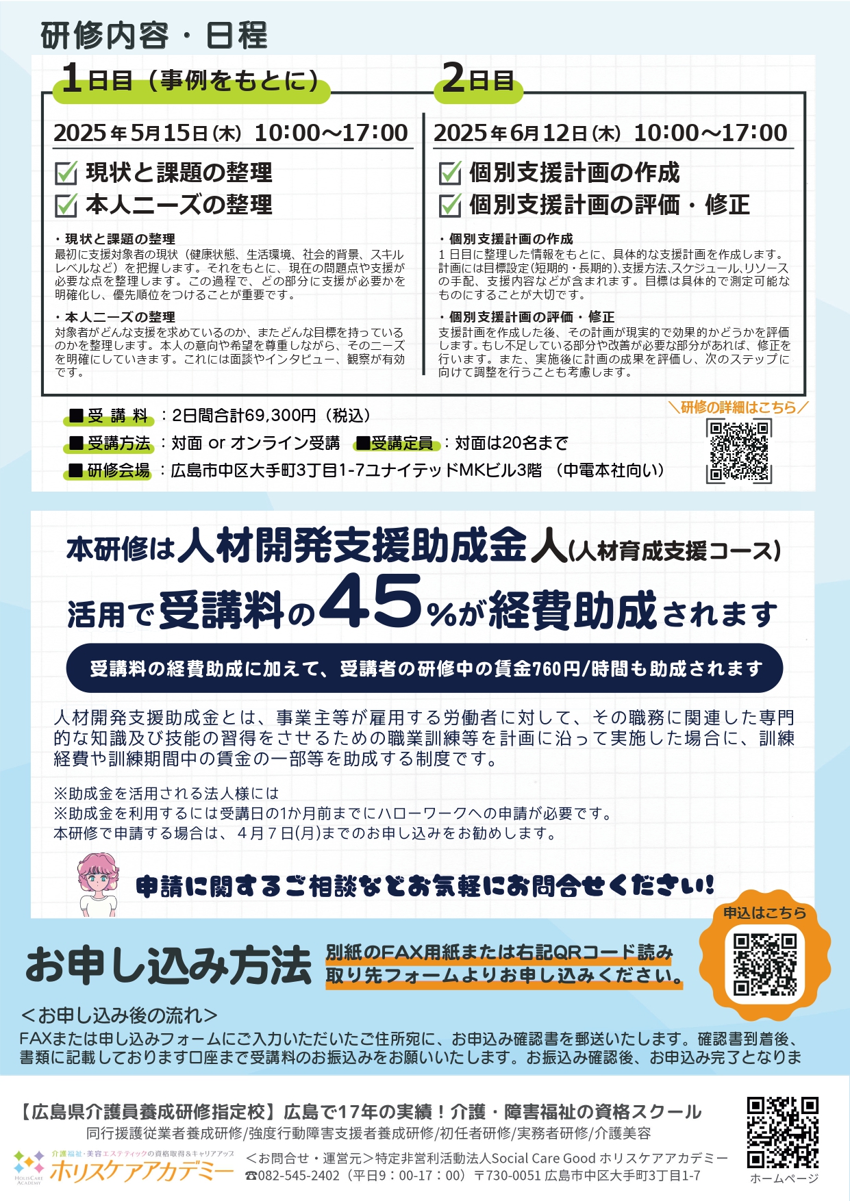 本研修は、人材開発支援助成金の申請が可能です。(助成金の支給は企業が対象となります)